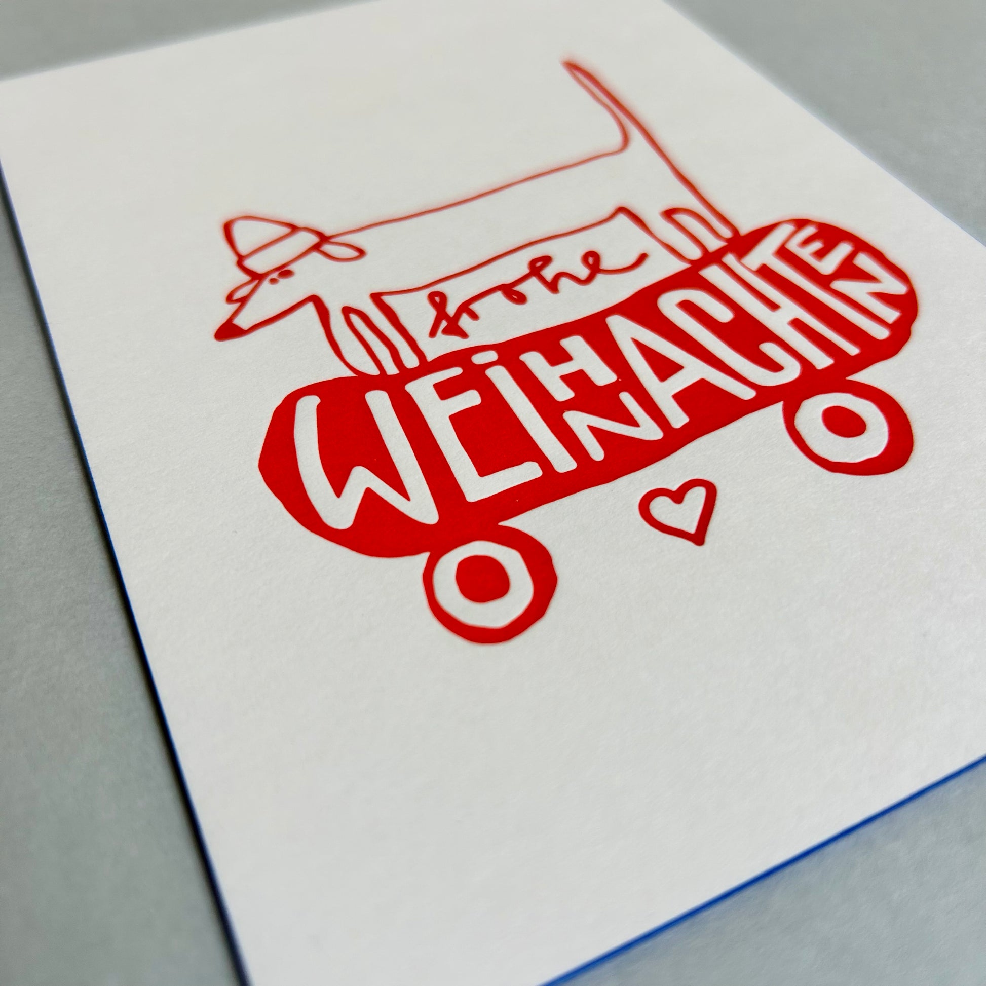 „Frohe Weihnachten/Hund“, rote Schrift mit blauem Farbschnitt